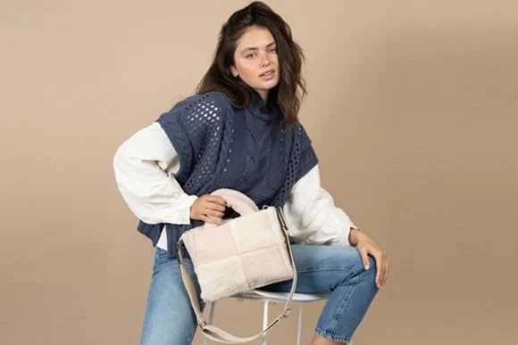 A model in a white shirt, jeans and a BCBGeneration blue knitted topper holding an ivory color sherpa BCBGeneration handbag on a beige background