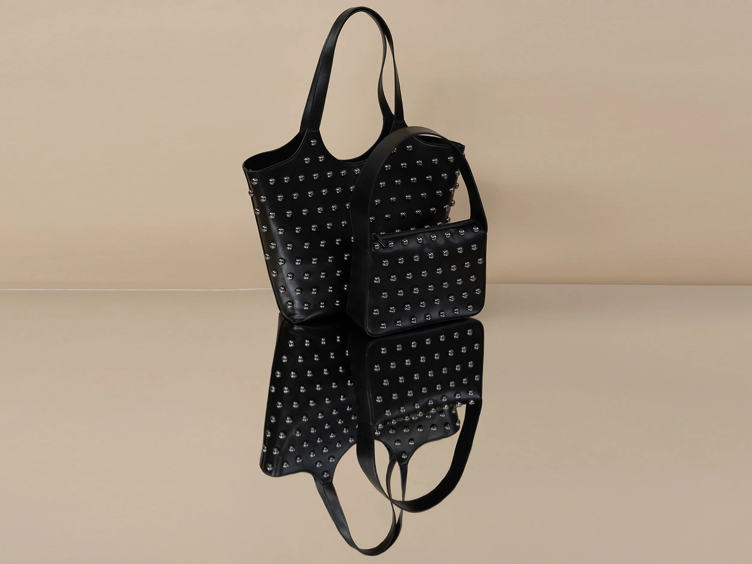 A pink studded leather BCBGeneration handbag on a beige background