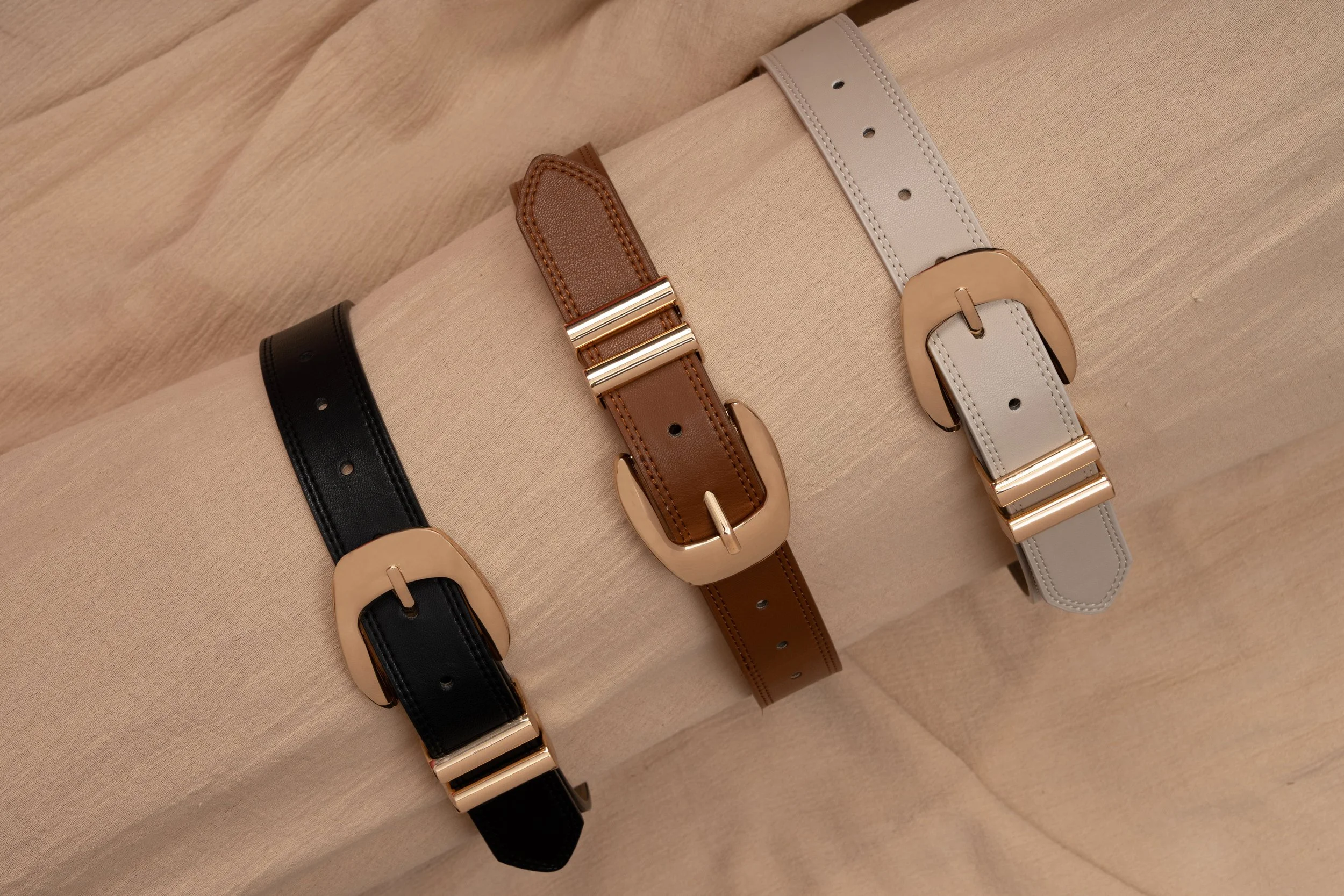 Three belts on a beige background -- a black leather belt with gold buckle, brown leather belt with gold buckle and an off-white leather belt with gold buckle