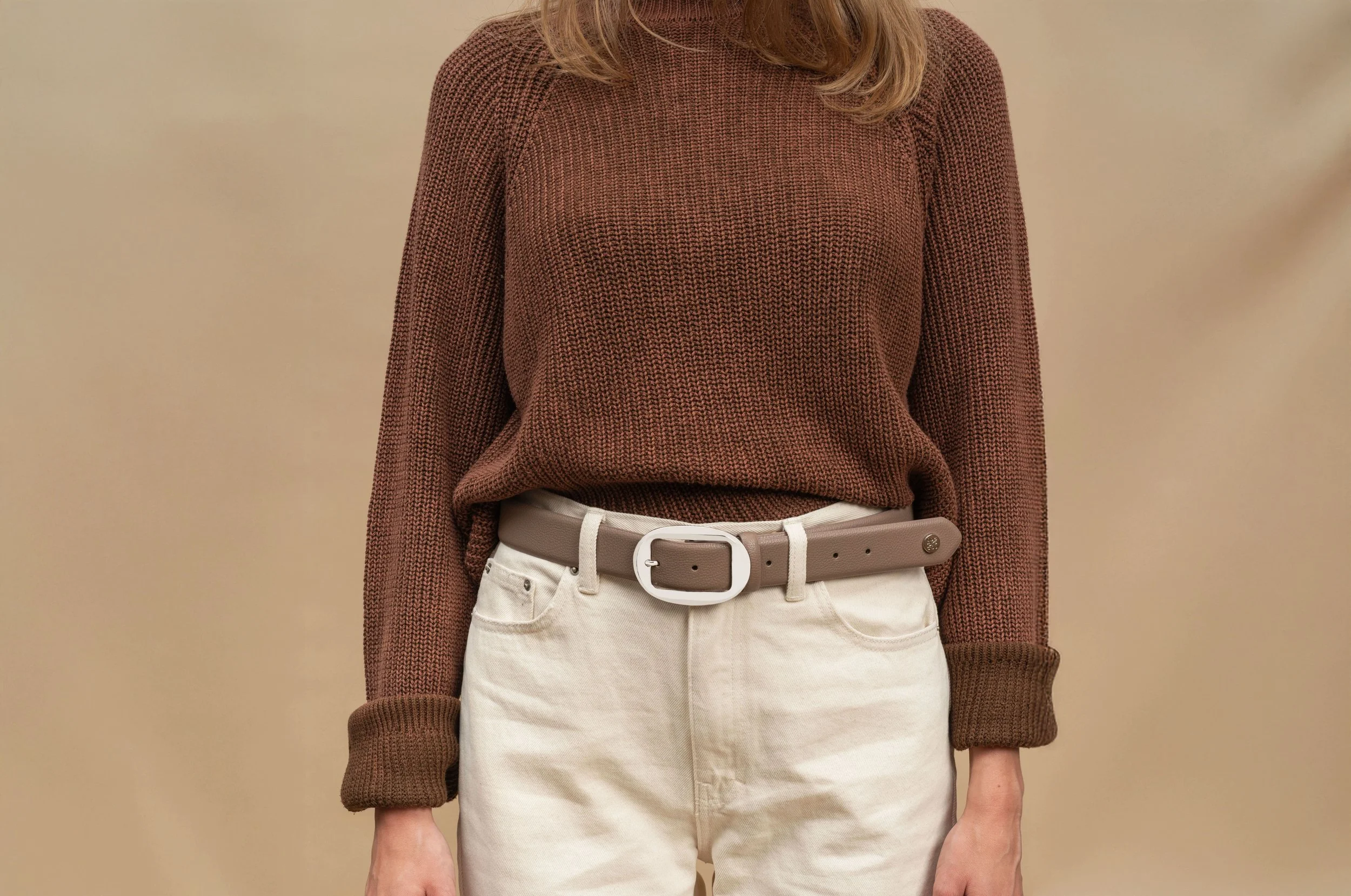 Model wearing a chocolate brown Nine West sweater and a light brown belt with cream jeans.