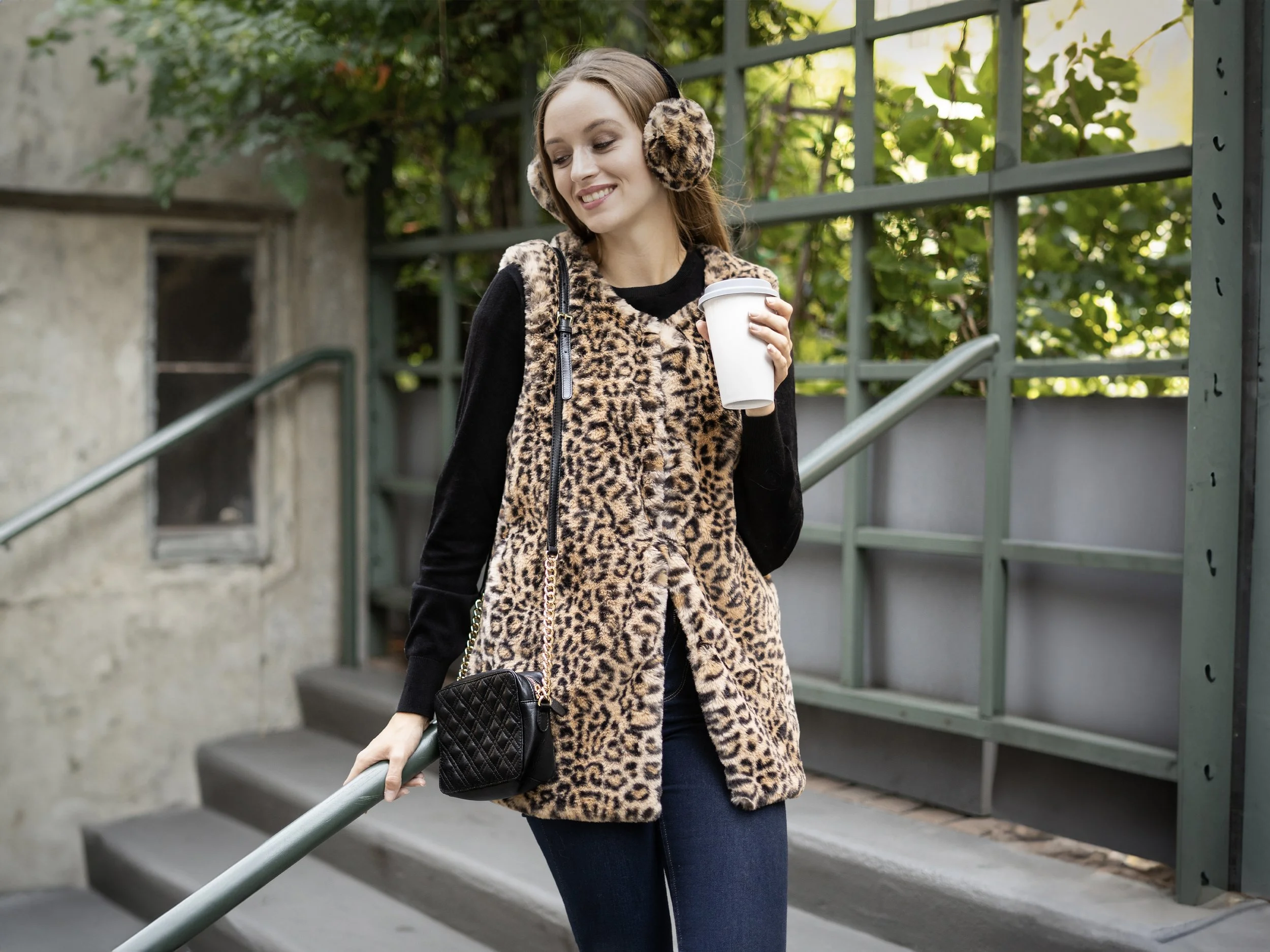 A model wearing a cheetah faux fur vest and matching ear muffs, holding coffee, leaning on metal rail