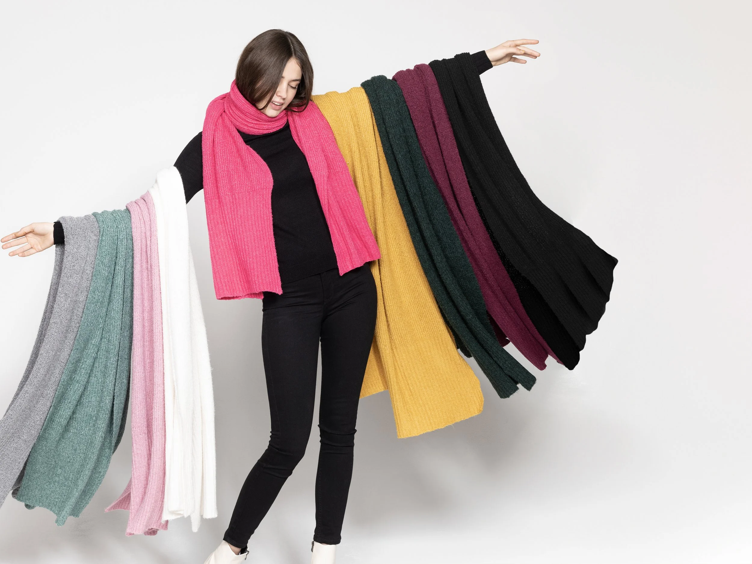 A model wearing a bright pink scarf with other scarves draped over her outstretched arms in various solid colors.