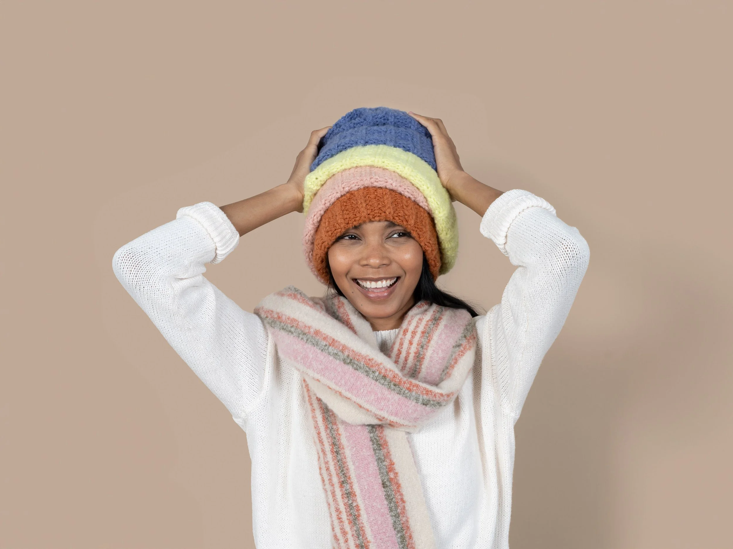 A model wearing four knit beanies and a pink, green, orange and white scarf