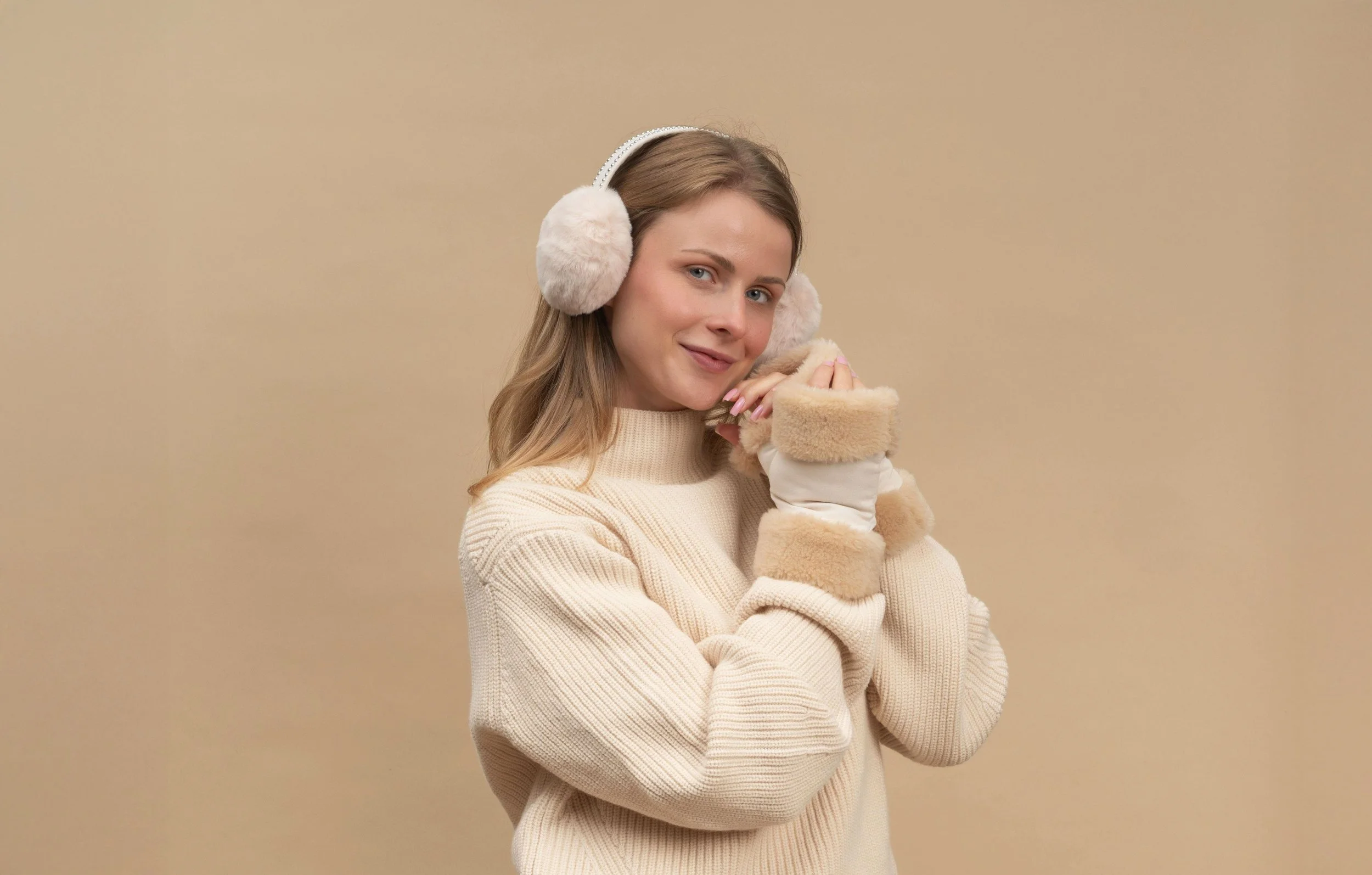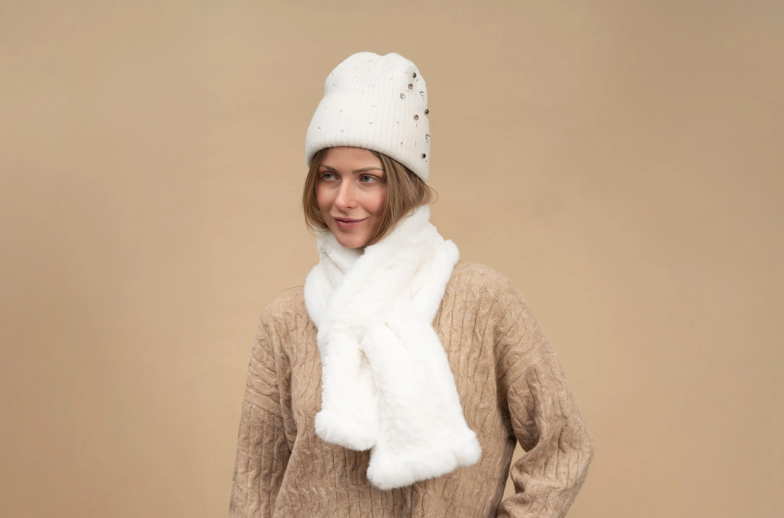 A model wearing a white faux fur beanie with rhinestones and a scarf