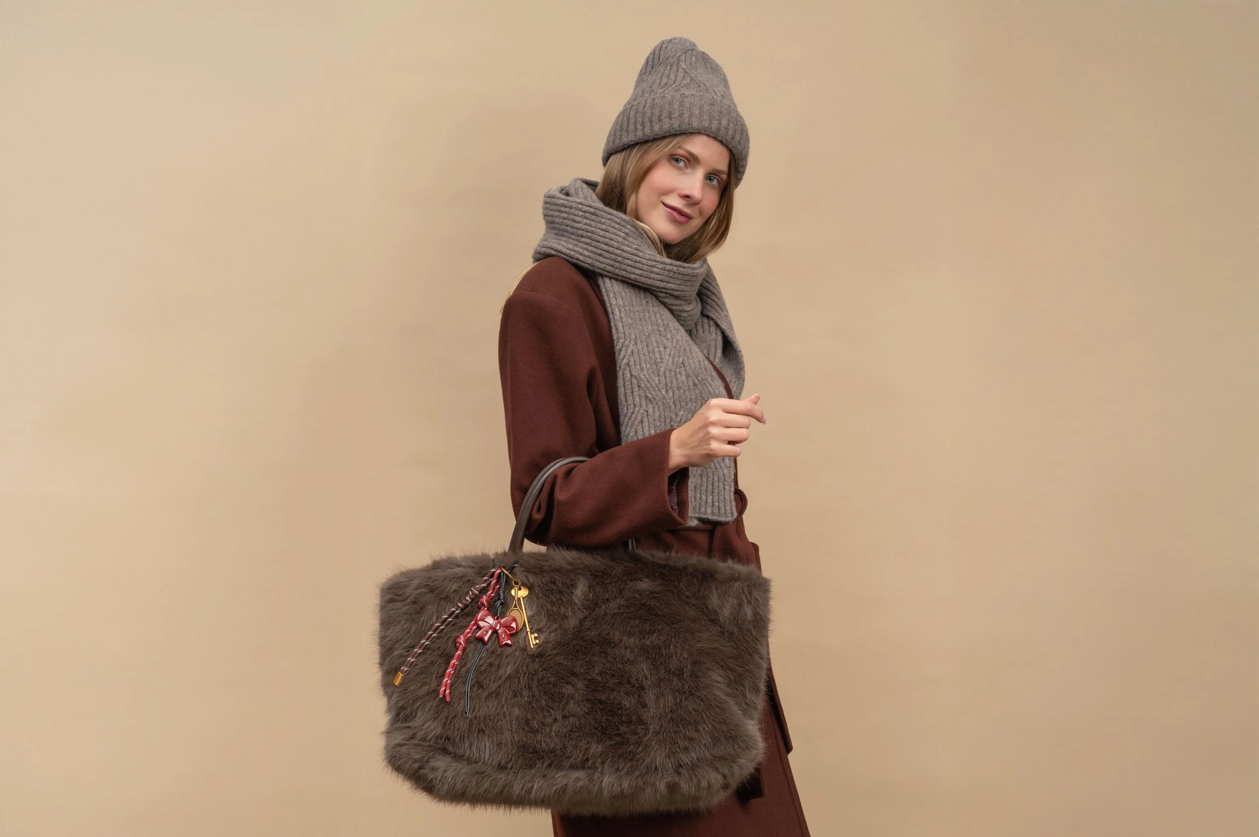 A model wearing a knitted gray beanie and scarf, holding a faux fur oversized bag with a bag charm