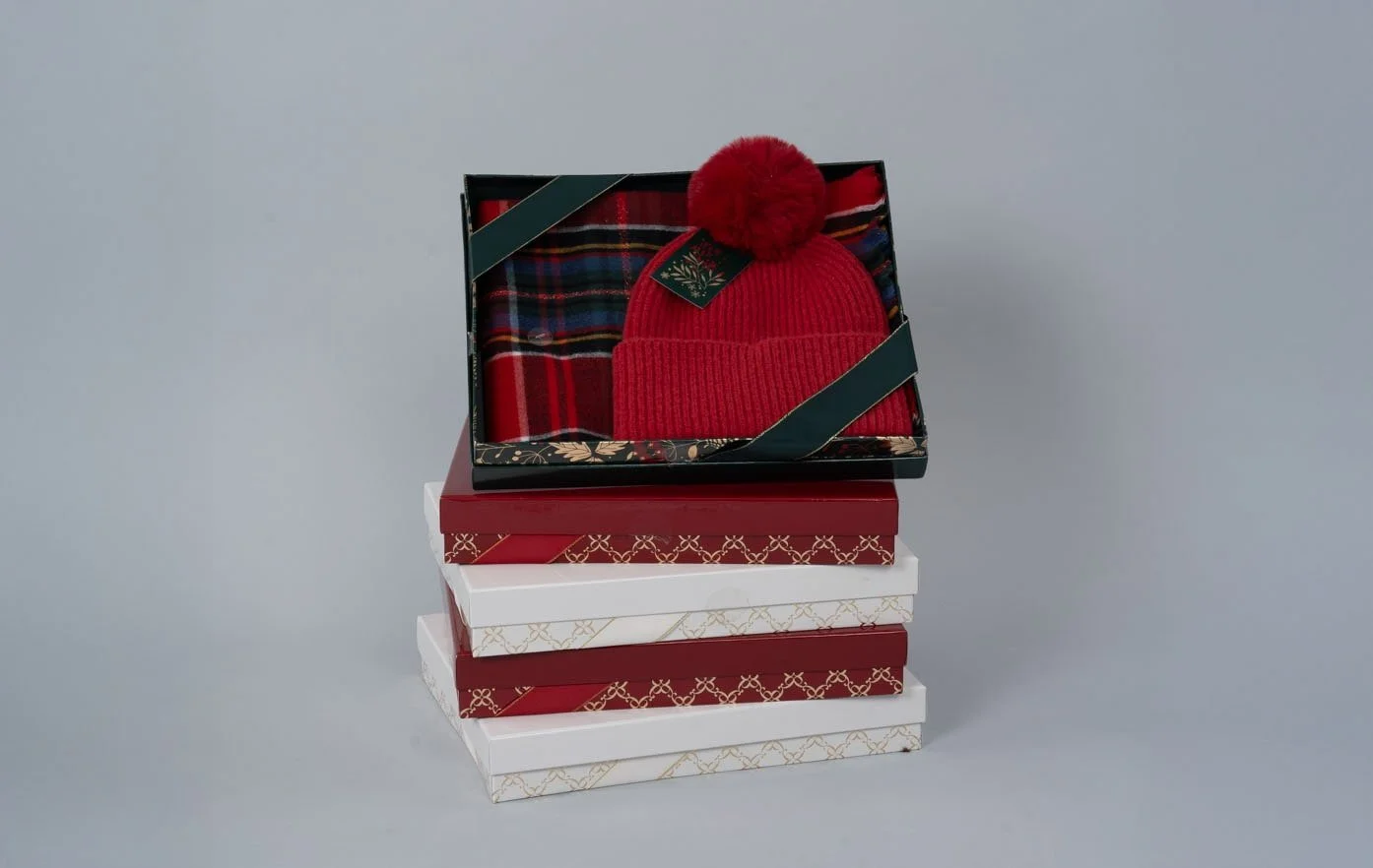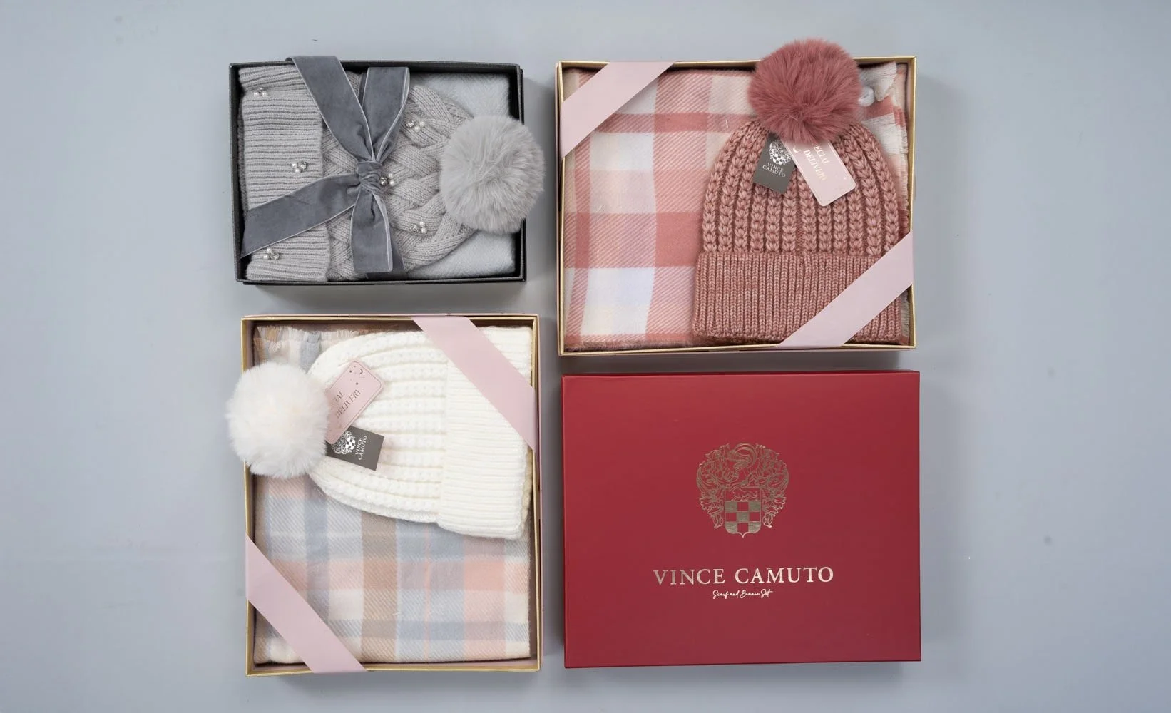 A stack of boxed Nine West winter sets of scarfs and knit hats.