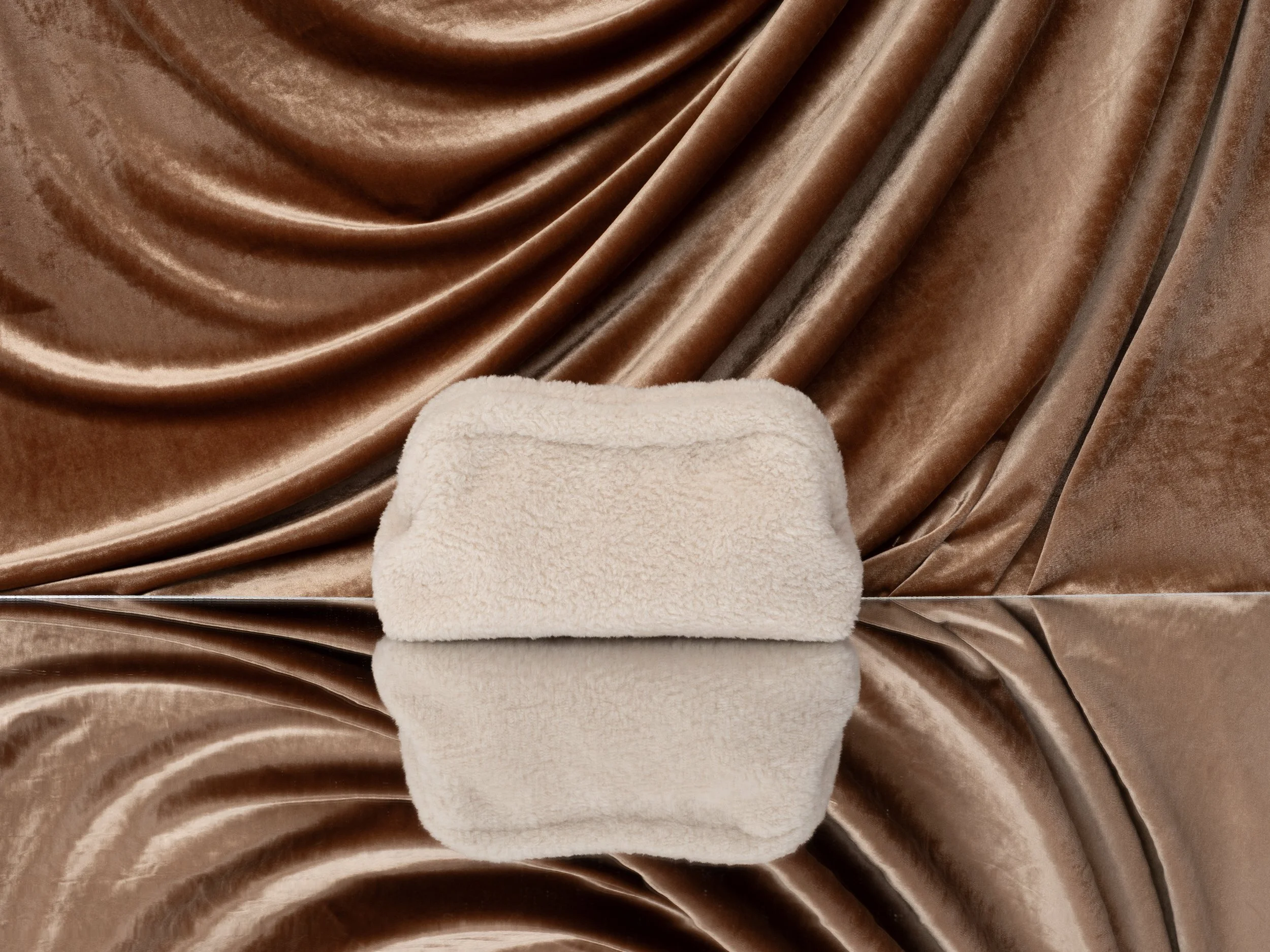 A small, beige, fuzzy pouch sits on a reflective surface against a backdrop of draped, shimmering brown velvet fabric. The clean lines and soft texture of the pouch contrast elegantly with the luxurious, flowing folds of the velvet.