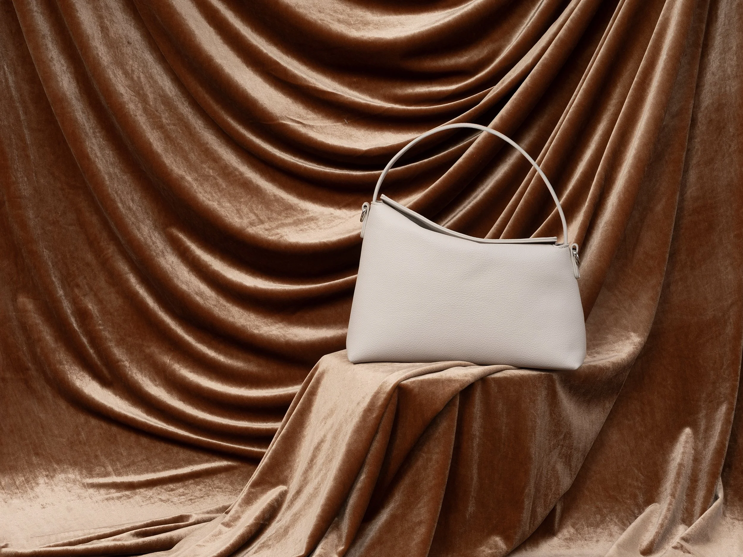 A light gray handbag with a single handle is displayed against a backdrop of rich, draped brown fabric. The bag is stylish and minimalist, placed prominently to showcase its design.