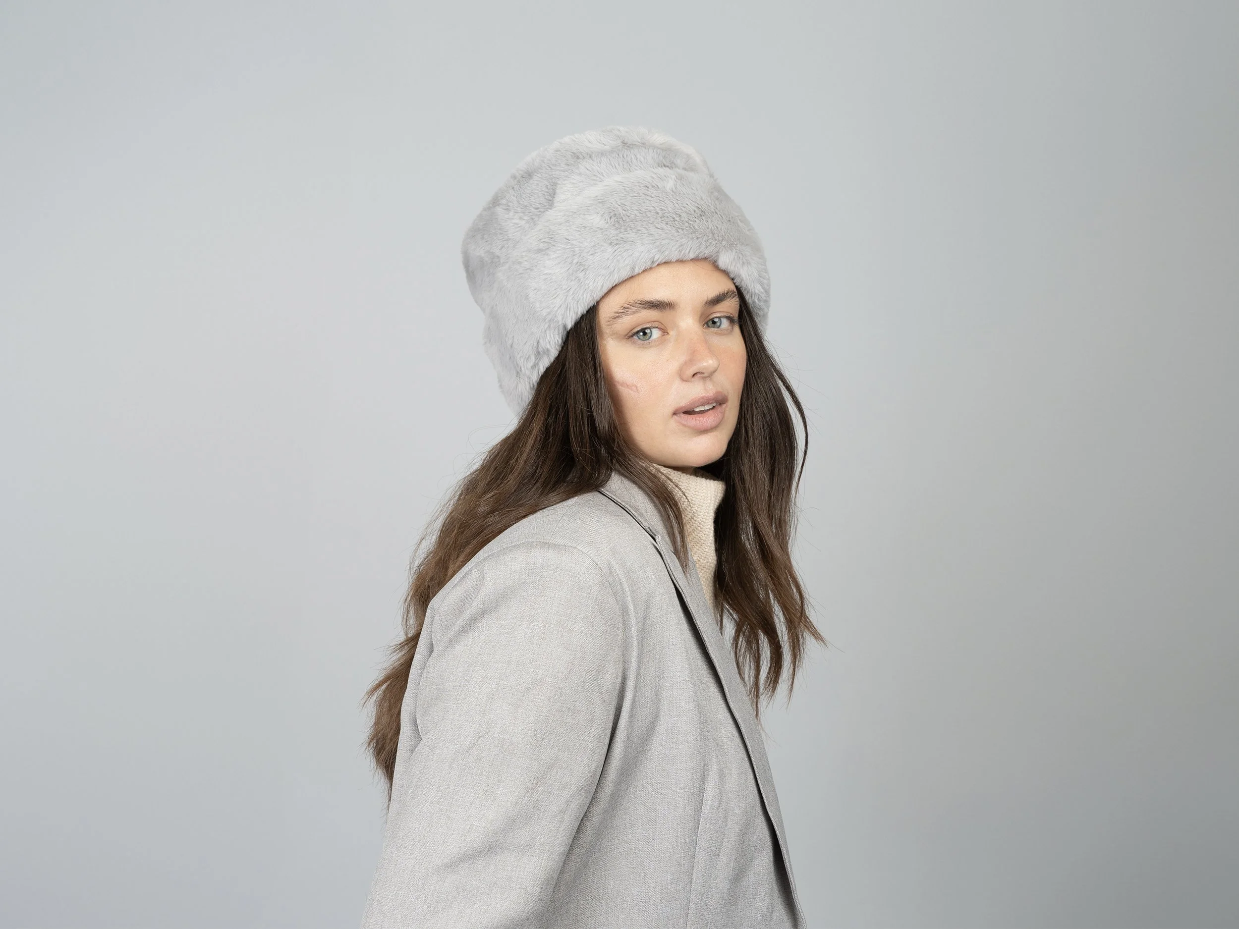 A person with long brown hair wearing a light gray faux fur hat and a gray coat, looking over their shoulder against a plain background.