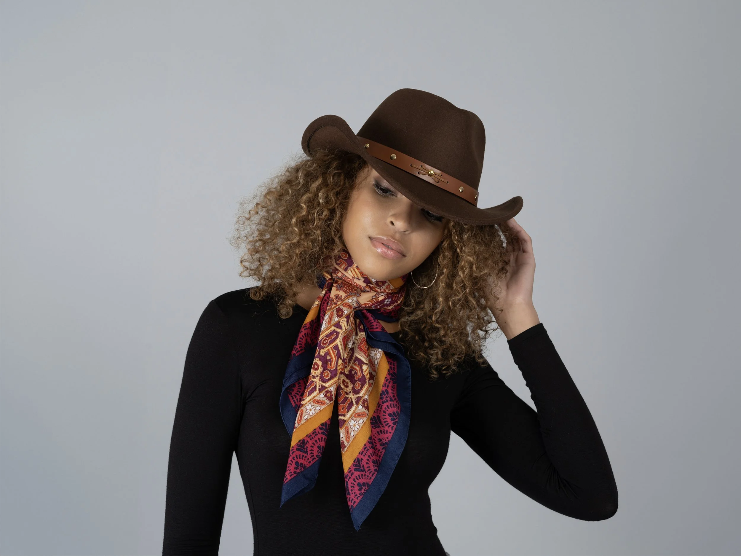 A woman with curly hair is wearing a brown cowboy hat, a colorful scarf, and a black top, posing against a plain background.
