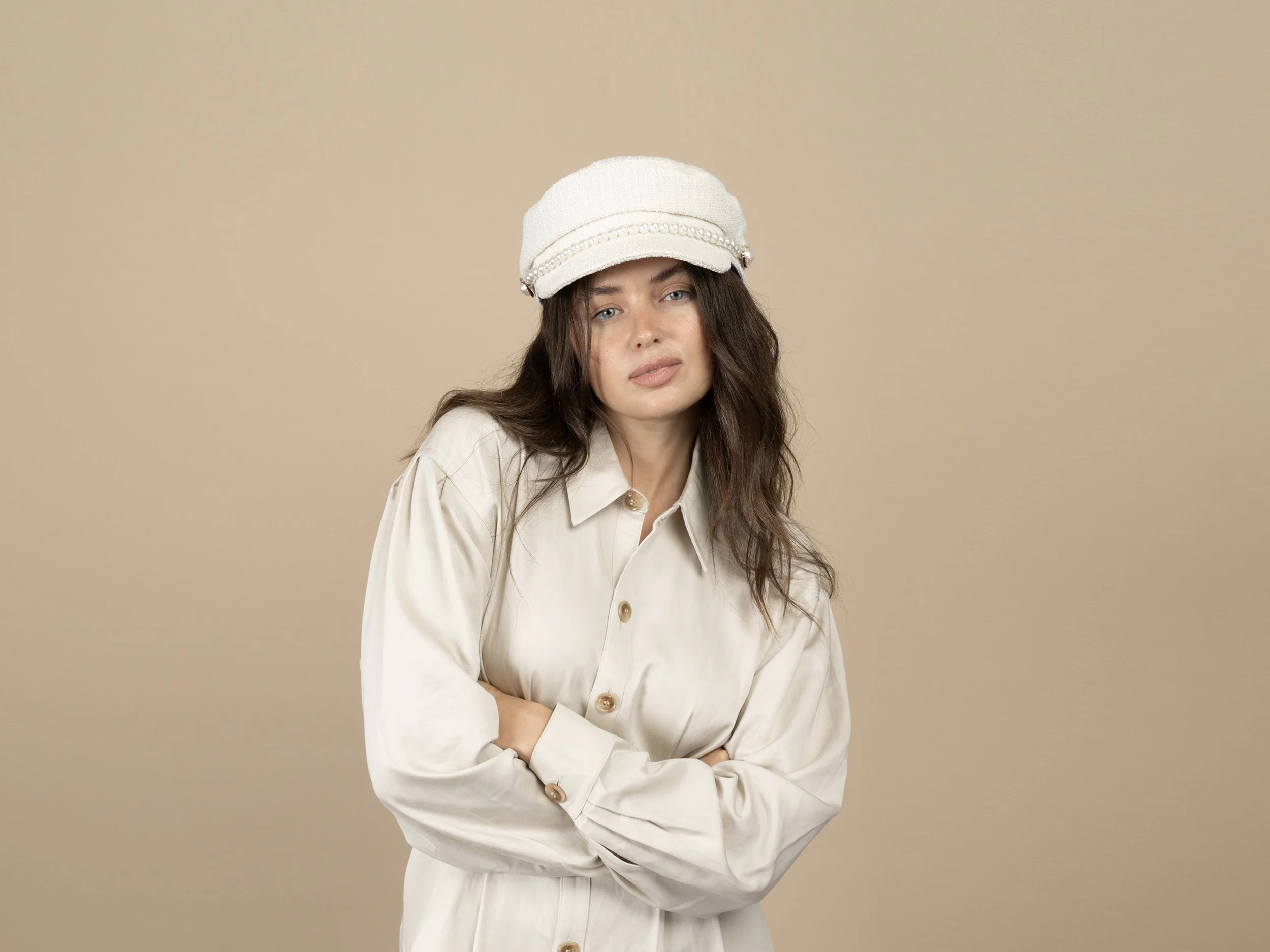 Woman wearing a white button-up shirt and a white cap stands against a plain beige background with her arms crossed.