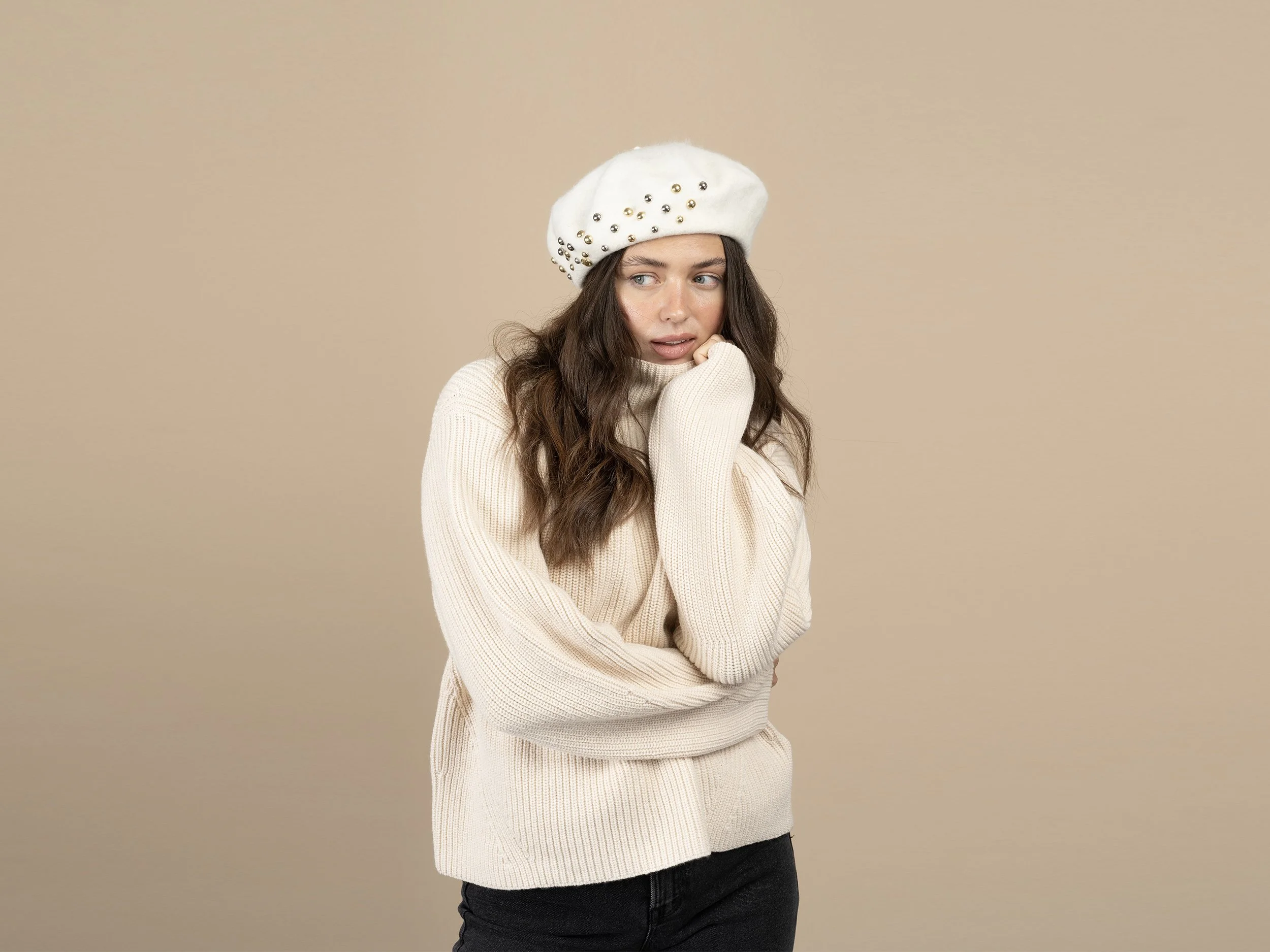 A person wearing a cream-colored sweater and a white beret stands against a beige background.