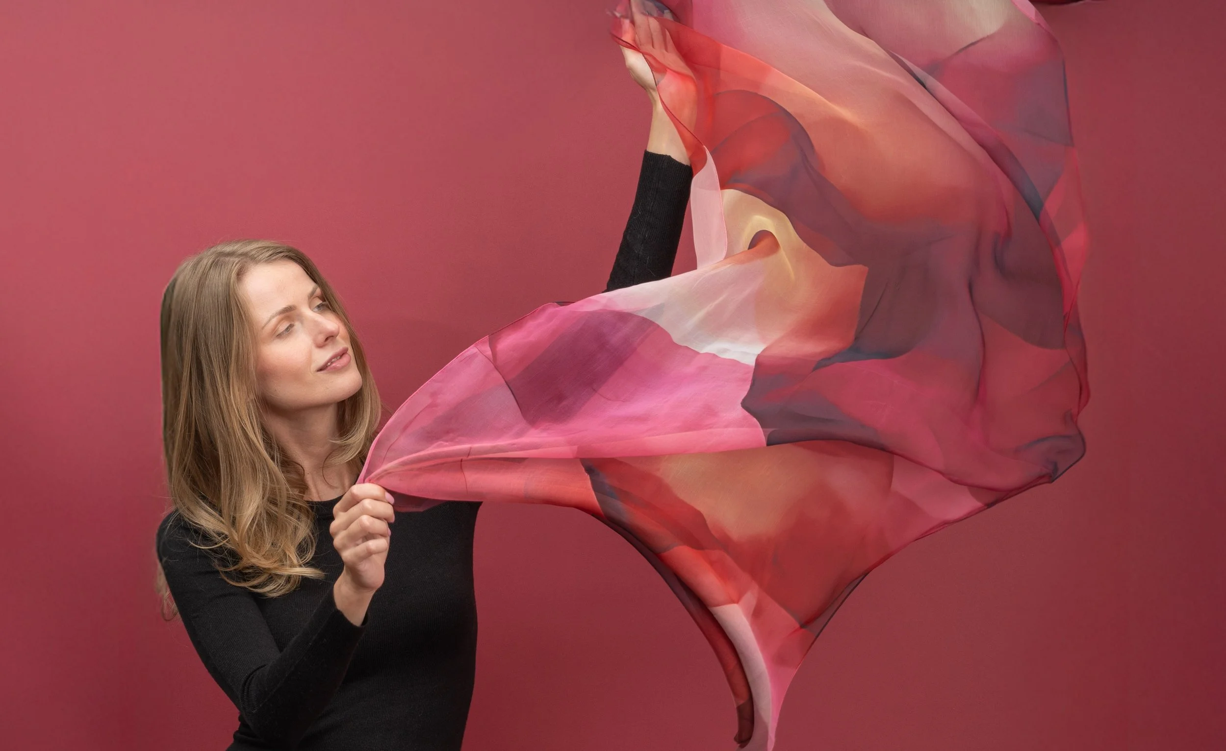 Model wearing a small painted silk scarf in white, pink and blue around her neck