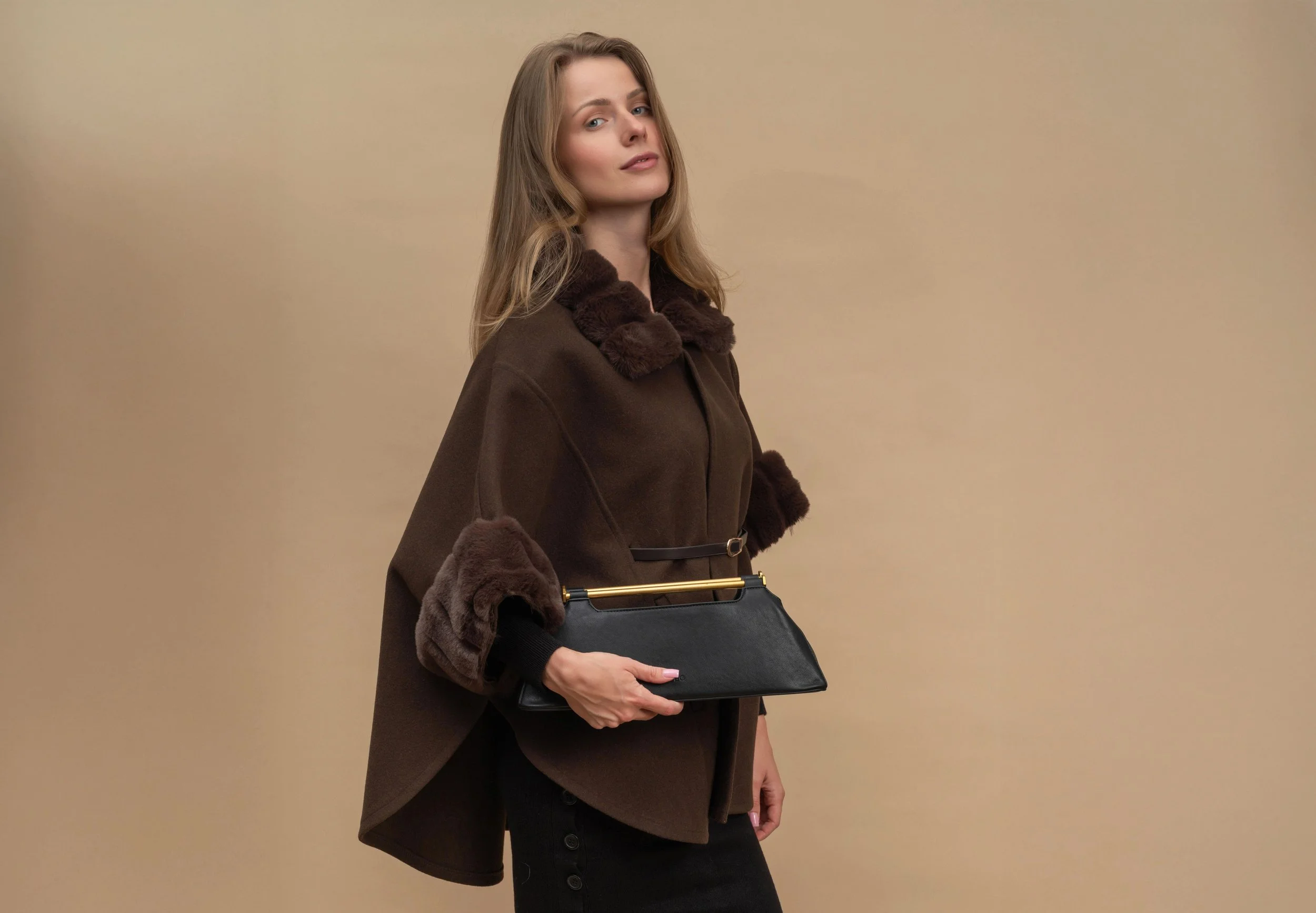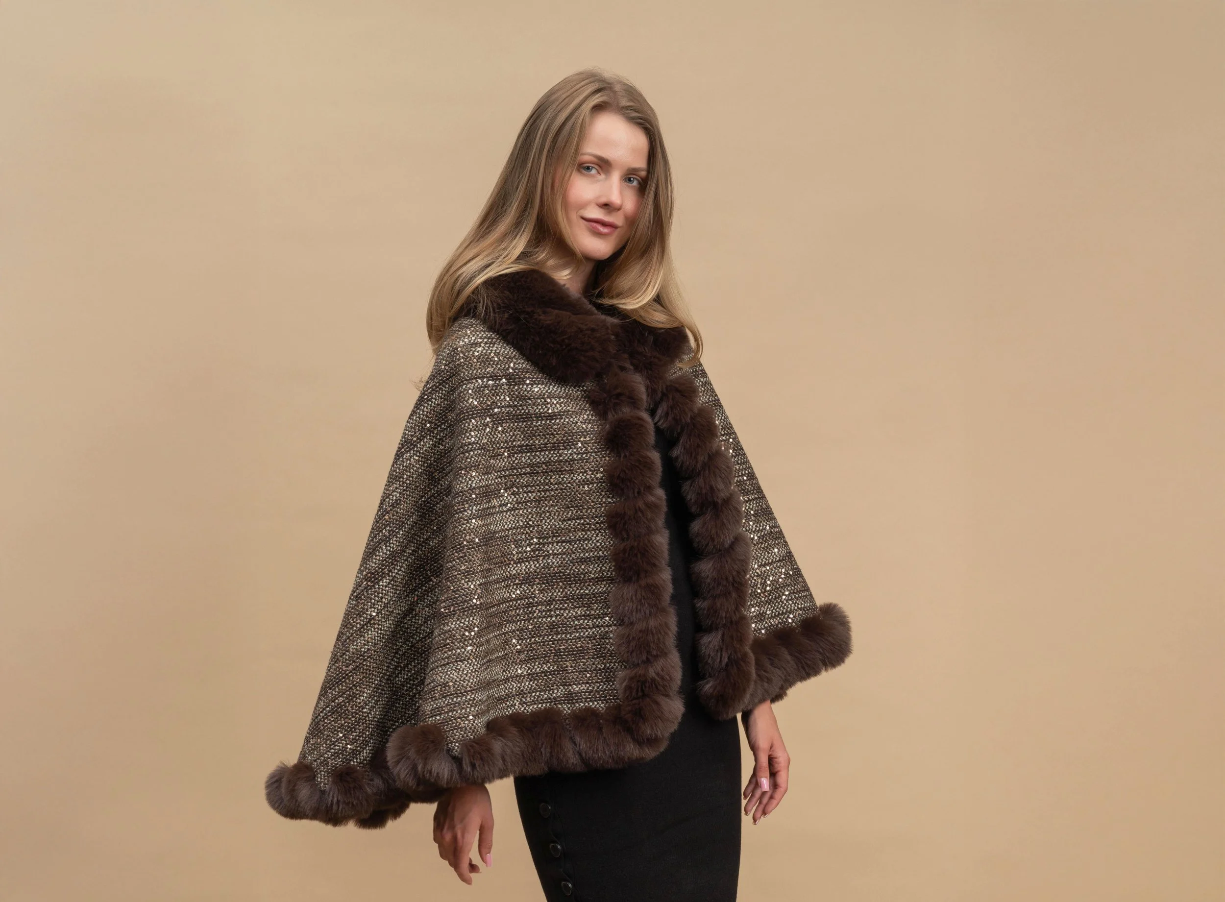 Model wearing a chocolate brown poncho with faux fur detail on collar and sleeves