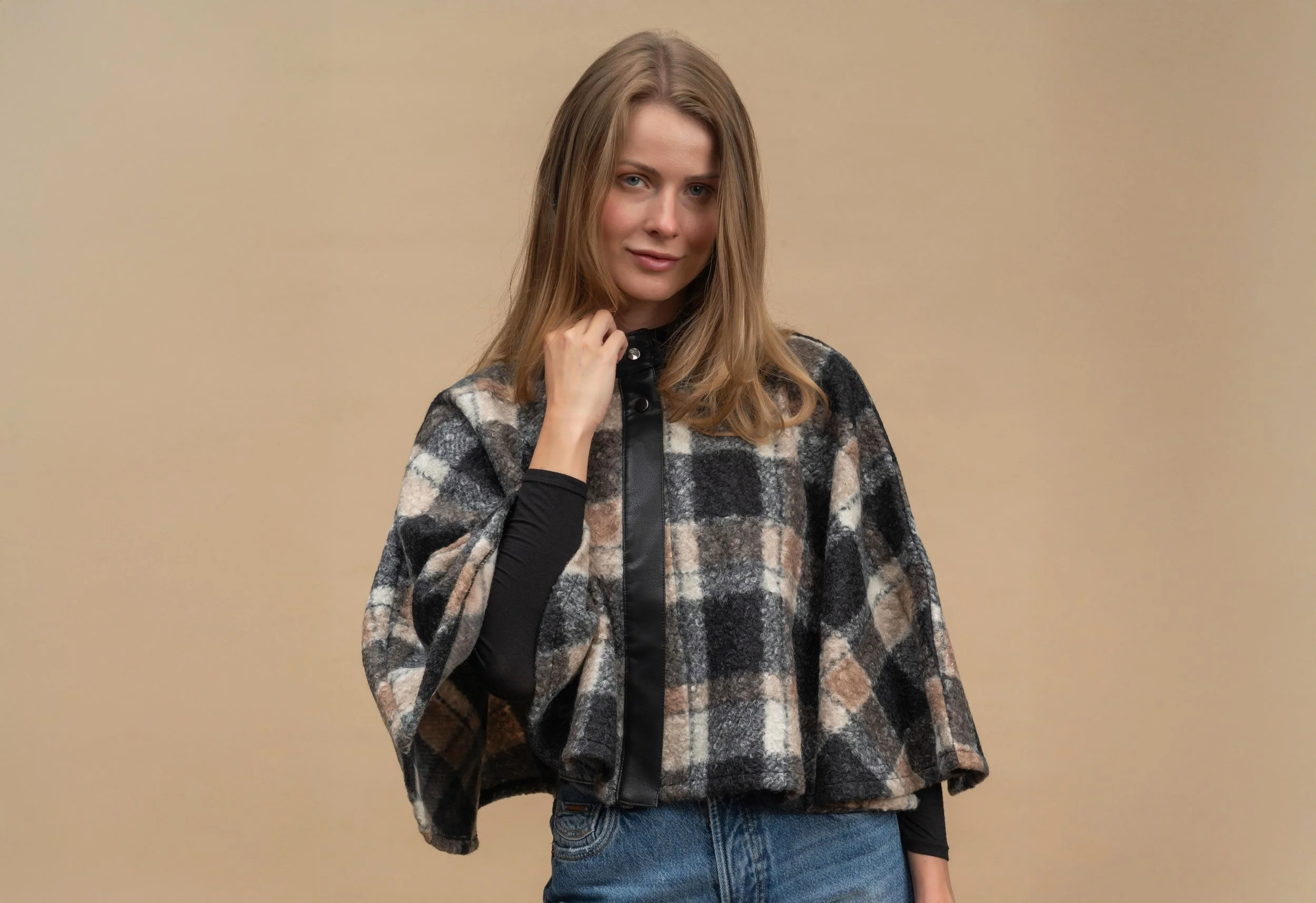 Model wearing a black studded beanie with a black and white tartan poncho topper with suede trim and chocolate brown detailing on the collar and sleeves