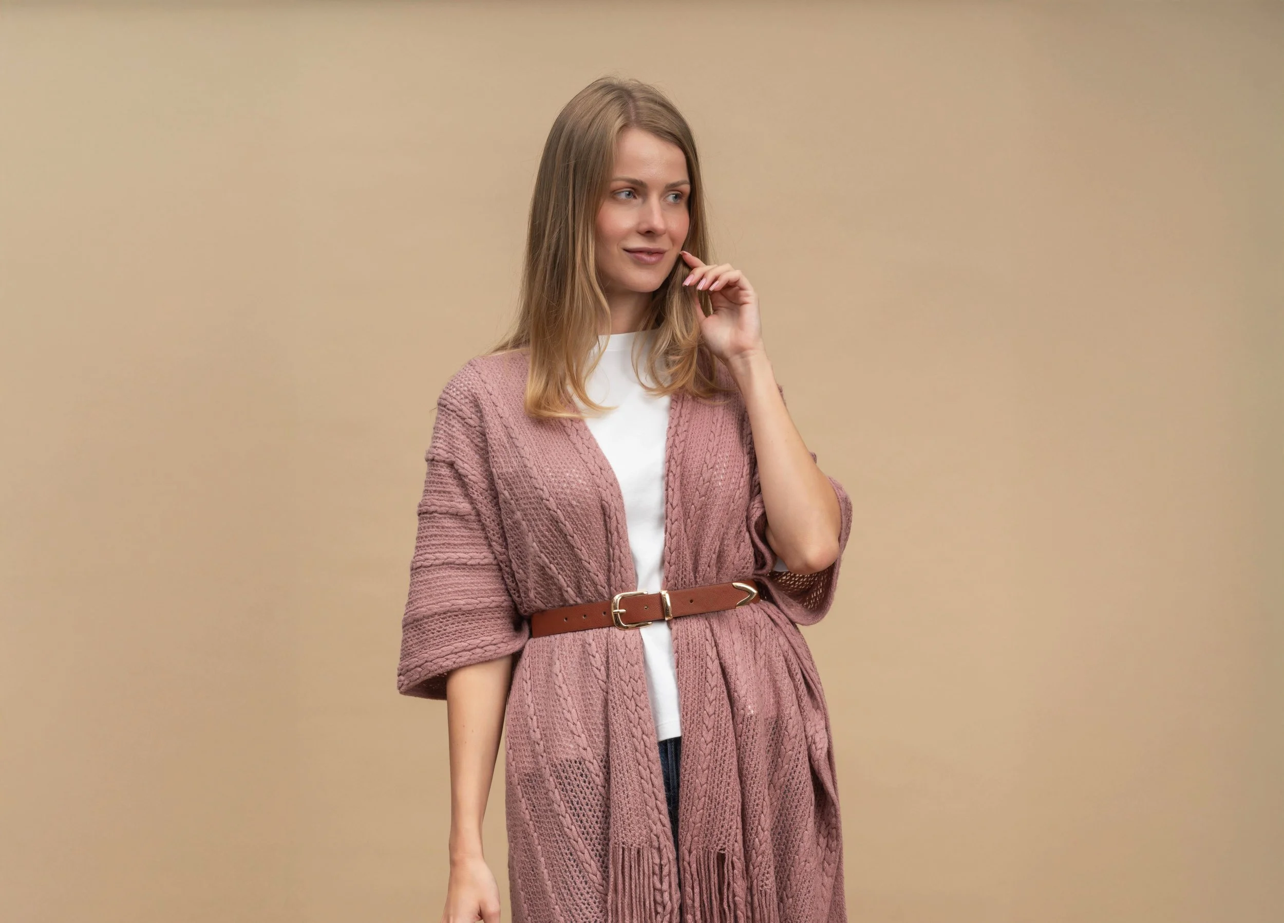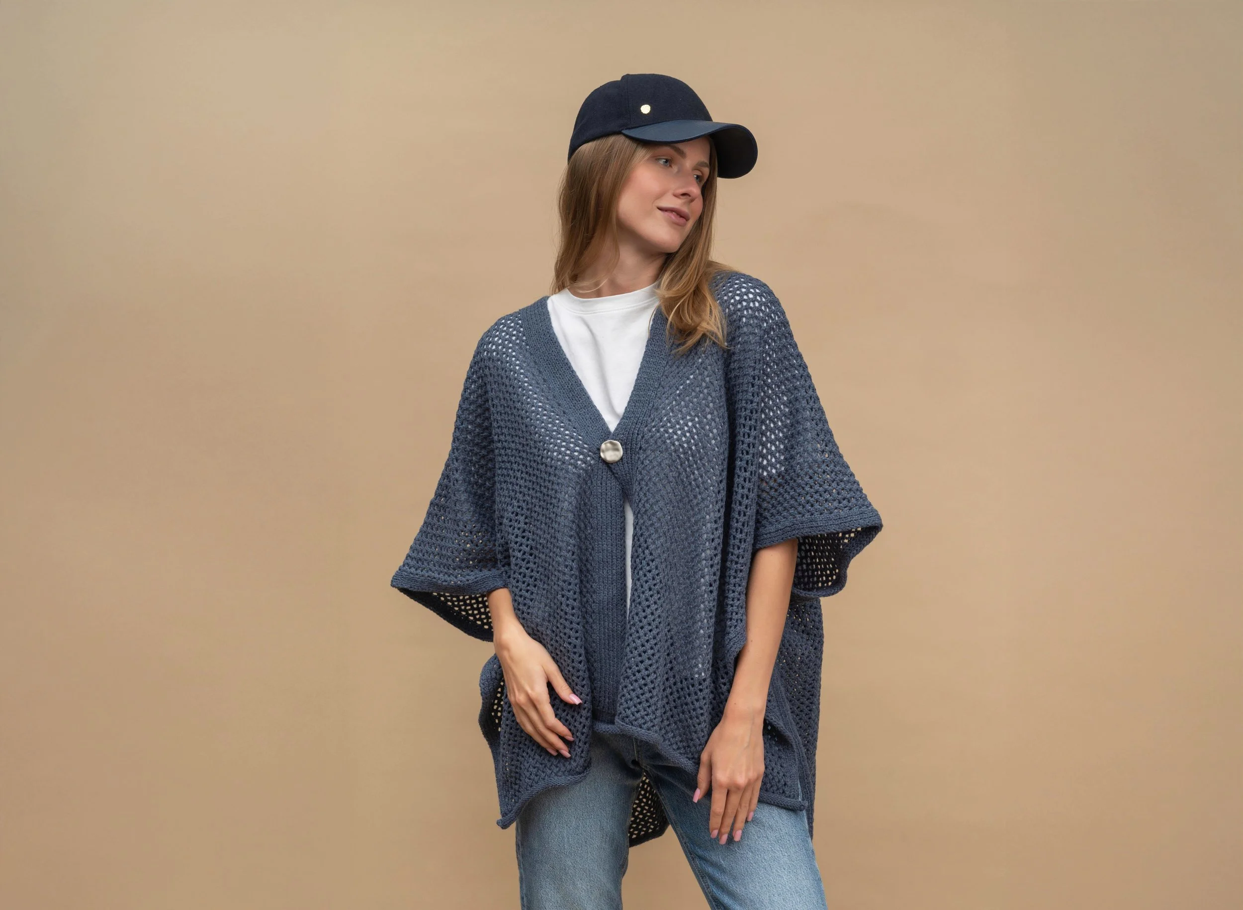 Model wearing a blue felt sports cap and blue knit cardigan with flared half sleeves