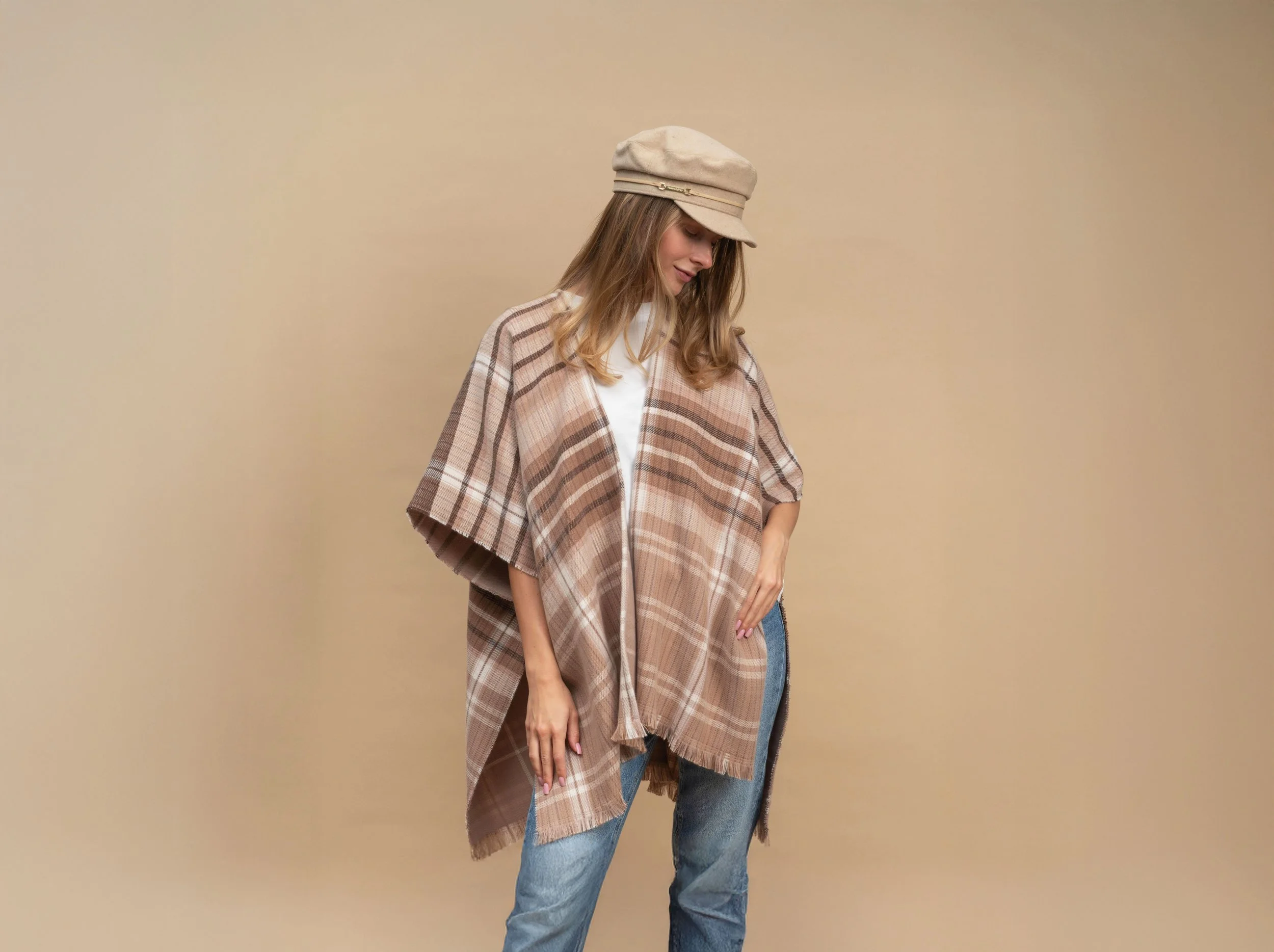 Model wearing a beige felt cap and light brown tartan poncho wrap