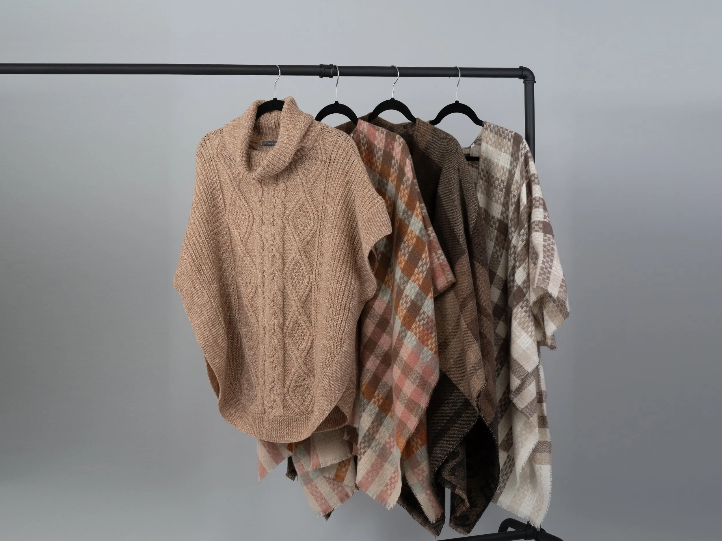 Three plaid toppers and one beige knitted poncho with a turtleneck hanging on black hangers on a black metal garment rack against a neutral background.