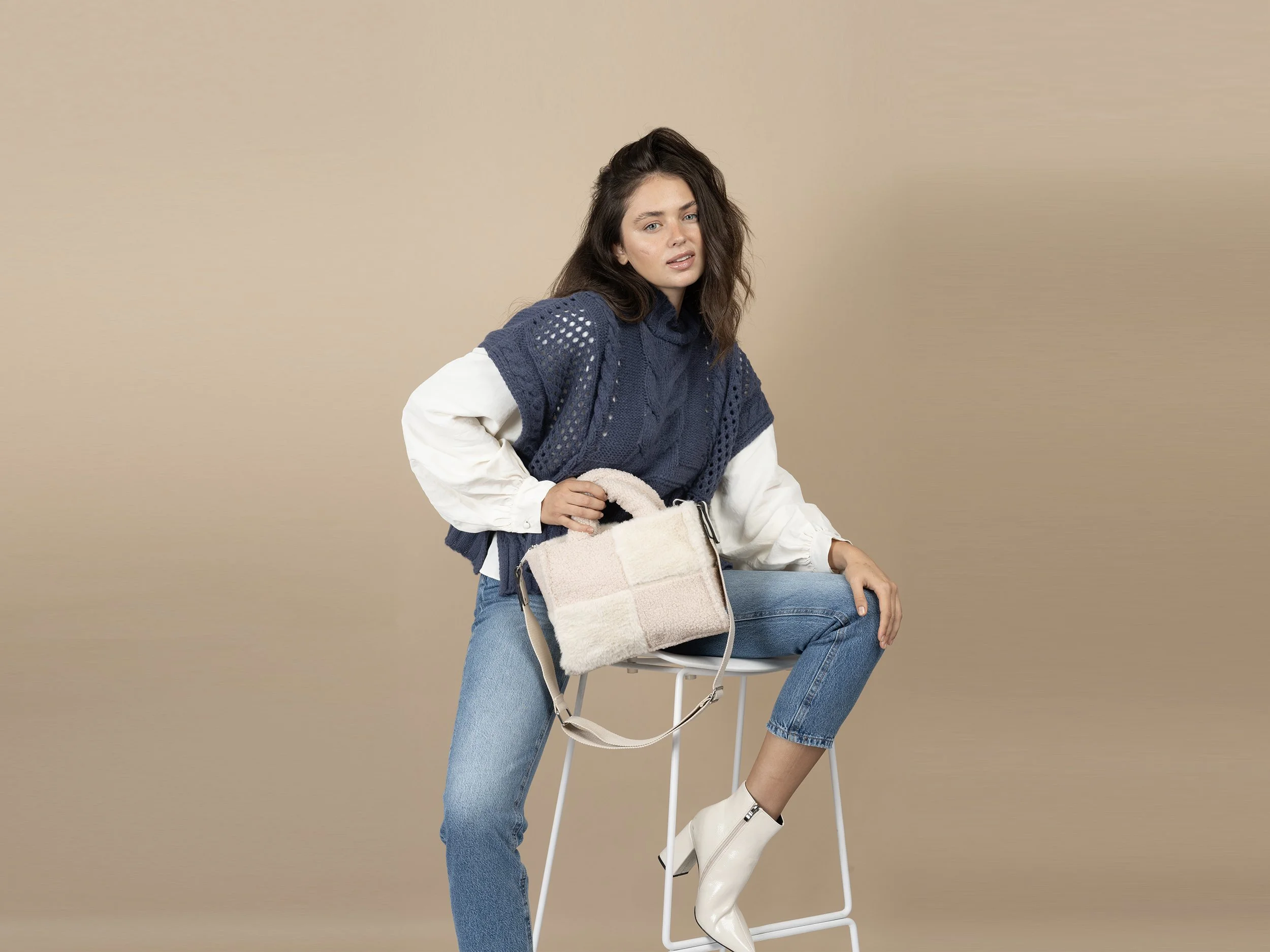 Model sitting on a stool, wearing a blue sweater over a white blouse, jeans, and white boots. She is holding a beige handbag in her right hand and has her left leg bent with the foot resting on the stool.