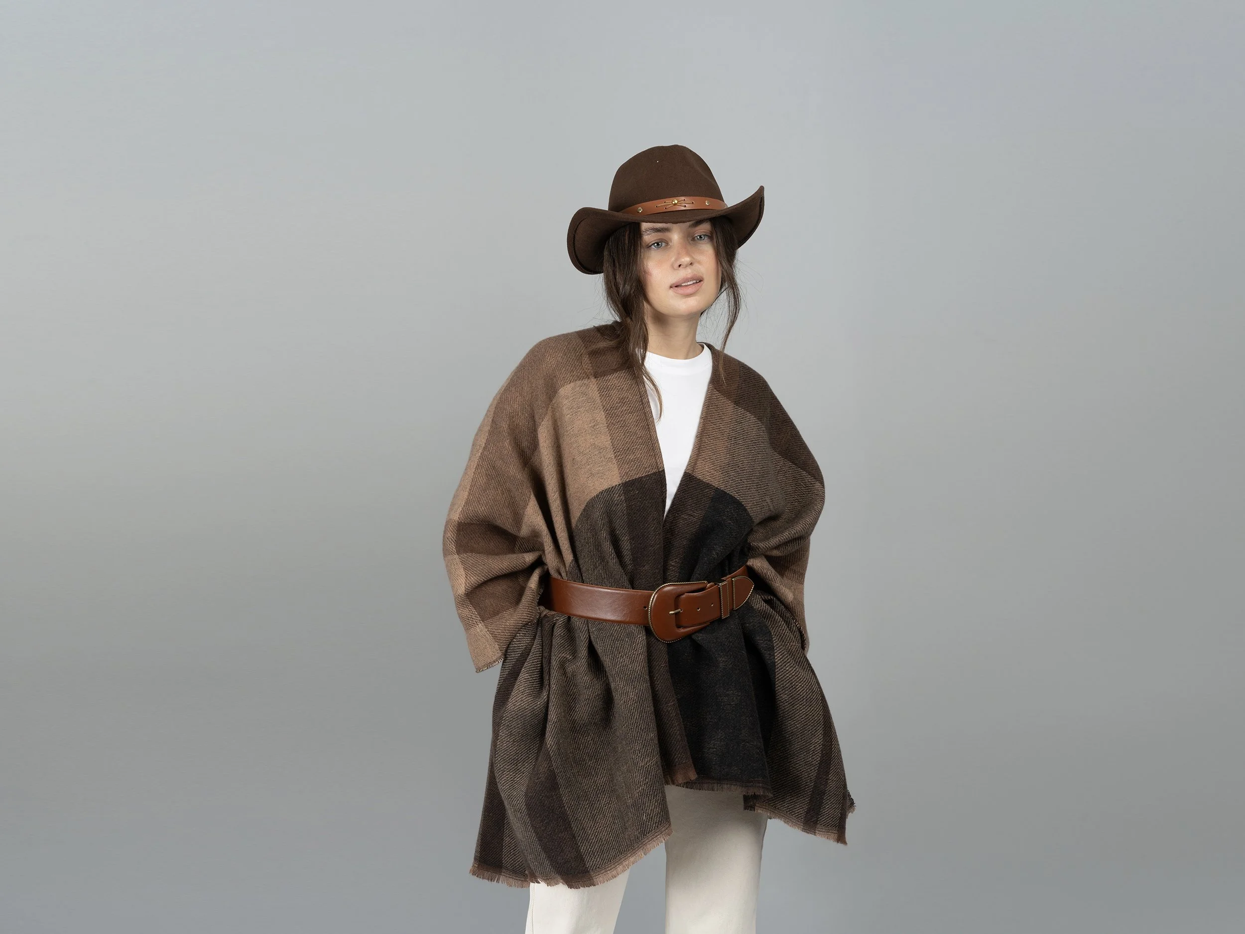 A model in a brown hat and checkered brown shawl with a brown belt stands against a grey background. They are wearing a white shirt and light pants.
