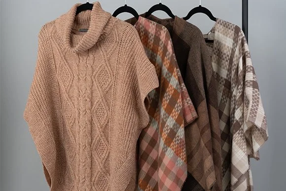 Four Vince Camuto knited and woven toppers in soft neutral colors are hanging on a rack in front of a grey background