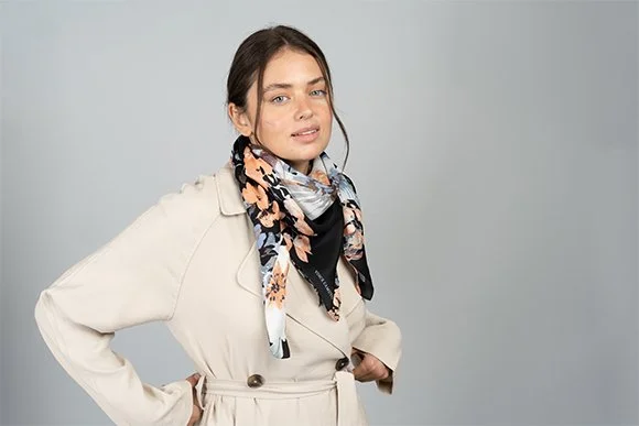 A model wearing a black Vince Camuto scarf with pastel color floral design against a grey background